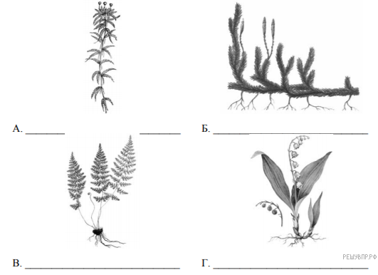 Подпишите их названия, используя слова из предложенного списка: однодольные, листостебельные мхи, папоротниковые, плауновые.