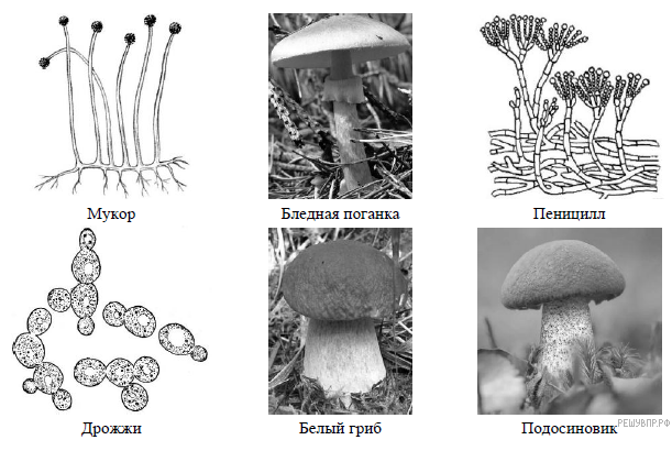 Рассмотрите изображения мира грибов. Предложите основание, согласно которому эти организмы можно разделить на две группы по три представителя в каждой.